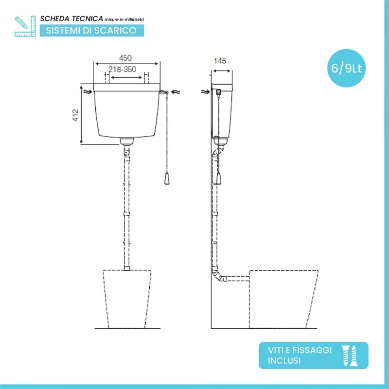 Cassetta di scarico Oli 41 cm in PS alta bianca 6/9 lt con catenella e leva Scheda tecnica Cassetta di scarico Oli 41 cm in PS alta bianca 6/9 lt con catenella e leva