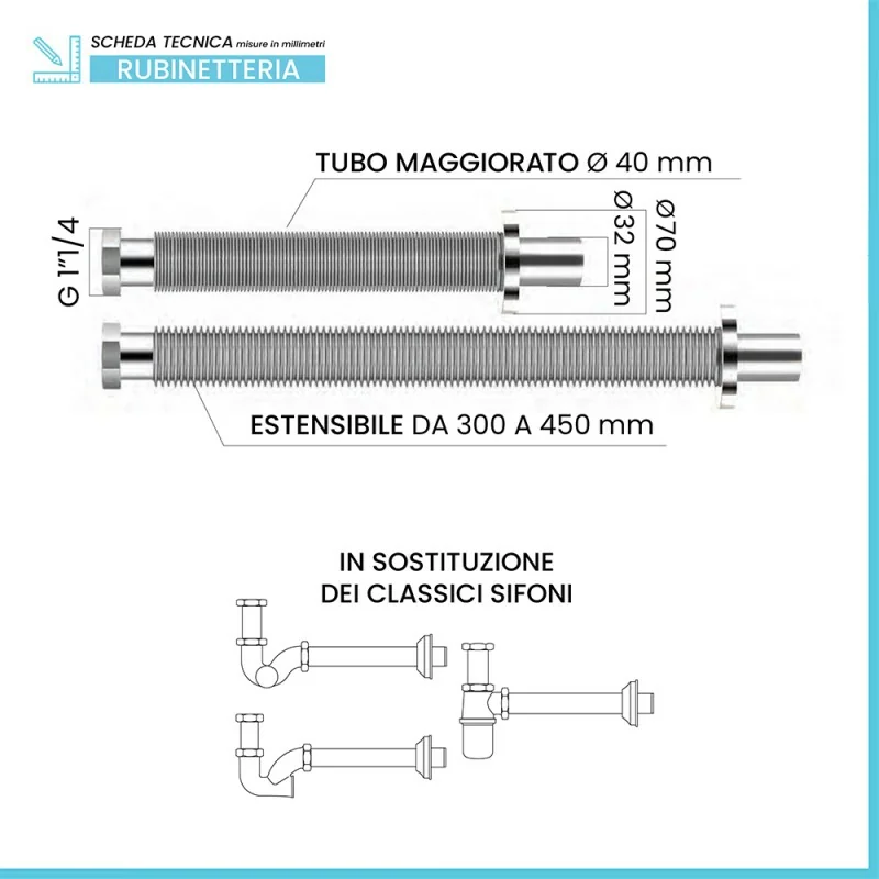 Tubo di scarico flessibile ed estensibile in acciaio inox 1”1/4 x 32
