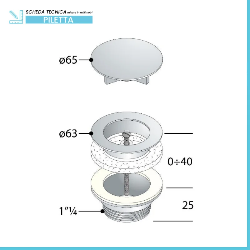 Piletta universale a scarico libero in acciaio con vite centrale e tappo cromo Scheda tecnica Piletta universale a scarico libero in acciaio con vite centrale e tappo cromo