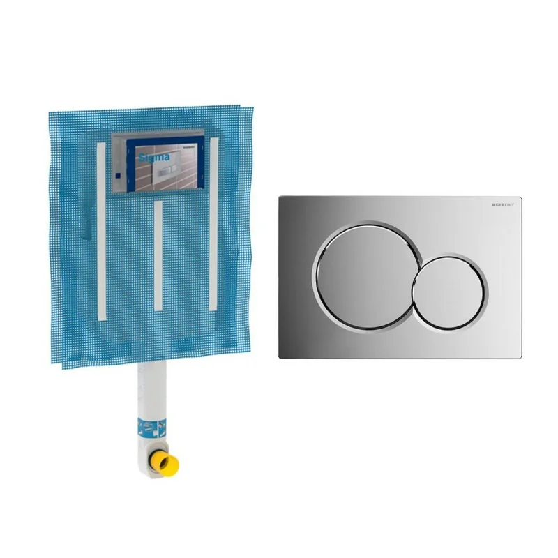Cassetta di scarico WC a pavimento Geberit ad incasso con doppio scarico per risparmio idrico. Completa di placca di comando cromata, offre silenziosità, efficienza e qualità costruttiva, ideale per pareti in muratura e installazioni a filo muro.