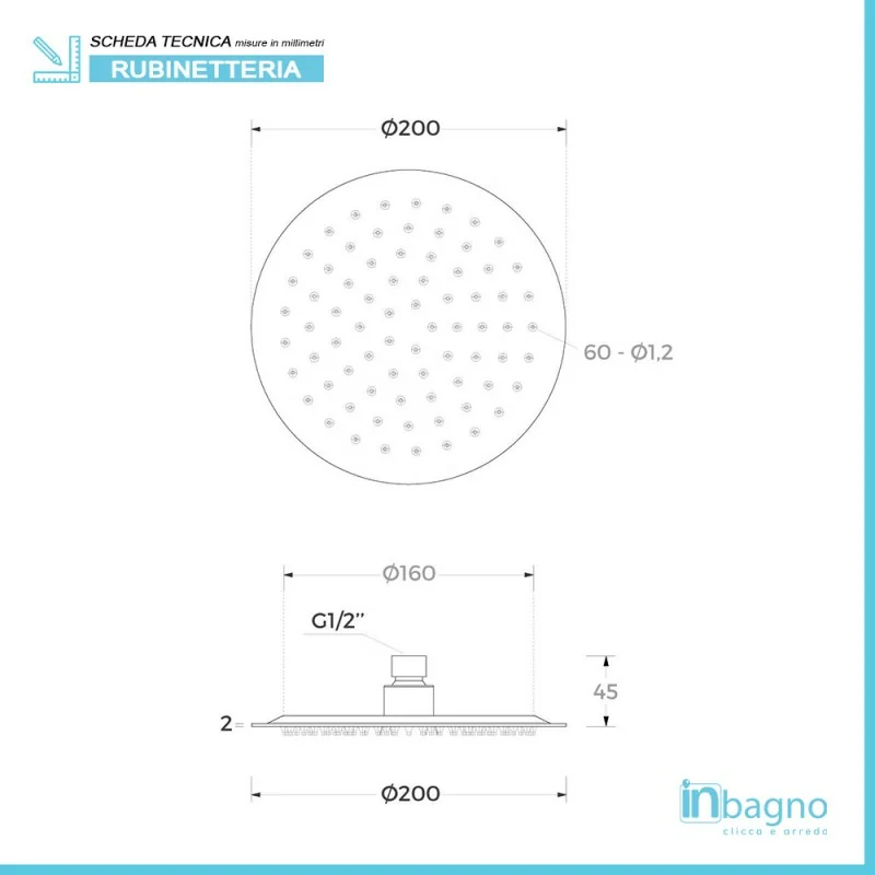 Soffione doccia tondo slim diametro 20 cm in acciaio cromato