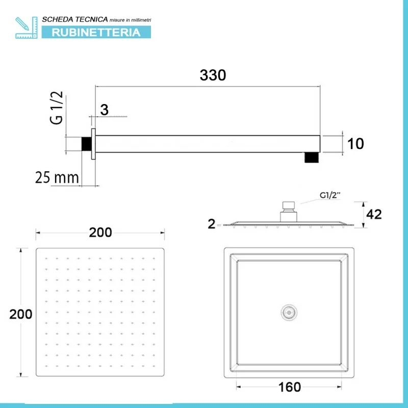 • Dimensione soffione:20x20 cm - H 4 cm;