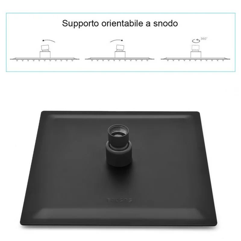 Questo set doccia è composto da un soffione quadrato di dimensioni 25x25 cm ed un braccio da 30 cm,entrambi in finitura nero opaco. Il soffione è realizzato in resistente acciaio inox che garantisce durevolezza e leggerezza del prodotto ed il braccio doccia è in acciaio.
