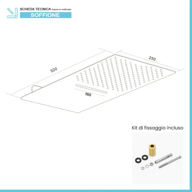 • Dimensioni soffione: L 25 x p 52 cm;spessore 0,5 cm;