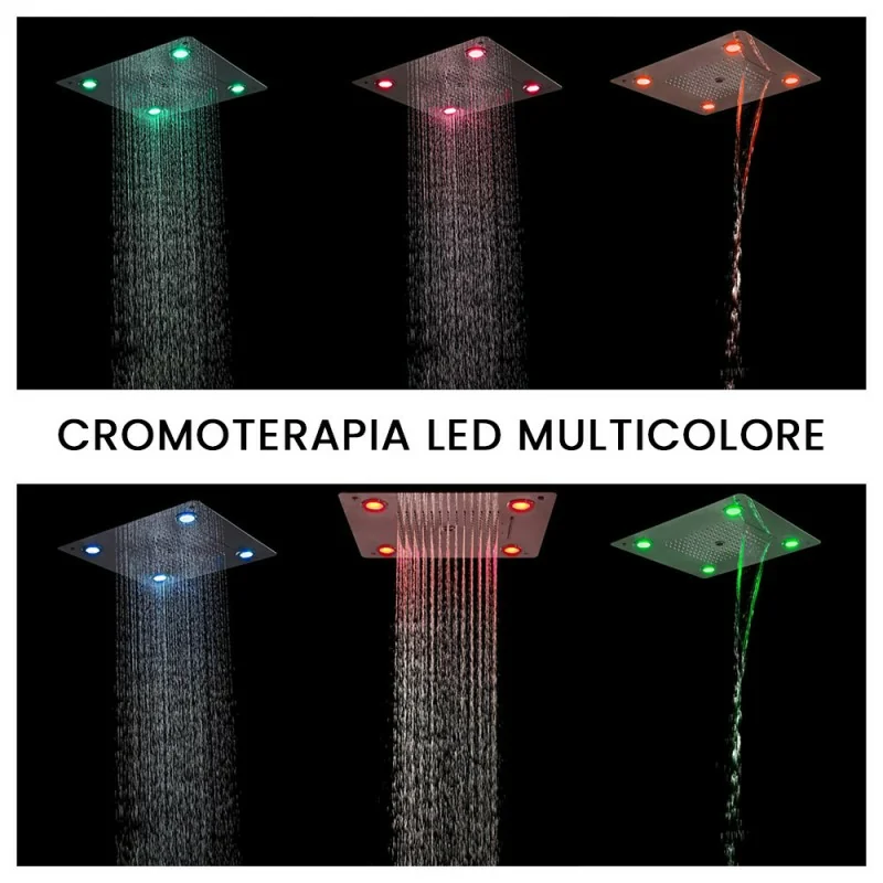 Soffione doccia ad incasso quadrato 50x50 con 3 getti e luci LED