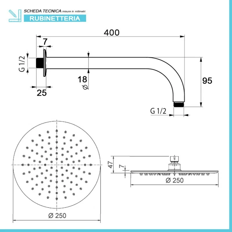 • Dimensioni soffione:Ø 25 cm x H 7 mm ultra slim;