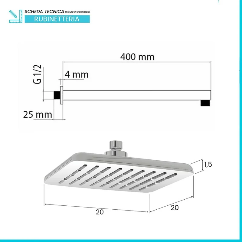 • Dimensione soffione: 20 x 20 cm H 1,5 cm;