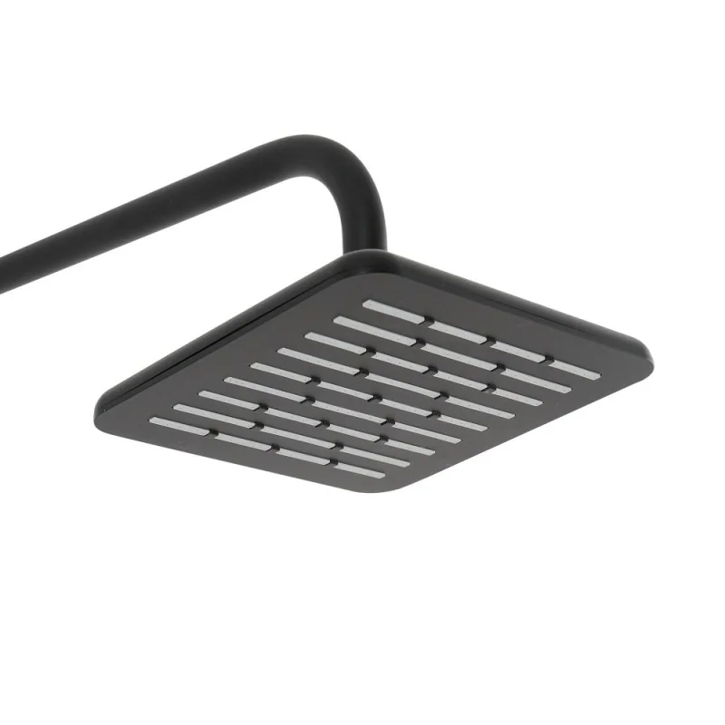 Il Set soffione doccia quadrato nero di  dimensioni 20 x 20 con braccio in acciaio di 35 cm, è realizzata mediante l’uso di materiale anticalcare. Il soffione è realizzato in ABS che garantisce durevolezza e leggerezza del prodotto, con attacco a snodo ruotabile fino a 360 gradi. Con ugelli anticalcare e attacchi standard universali da G 1/2 è compatibile con qualsiasi impianto idrico.