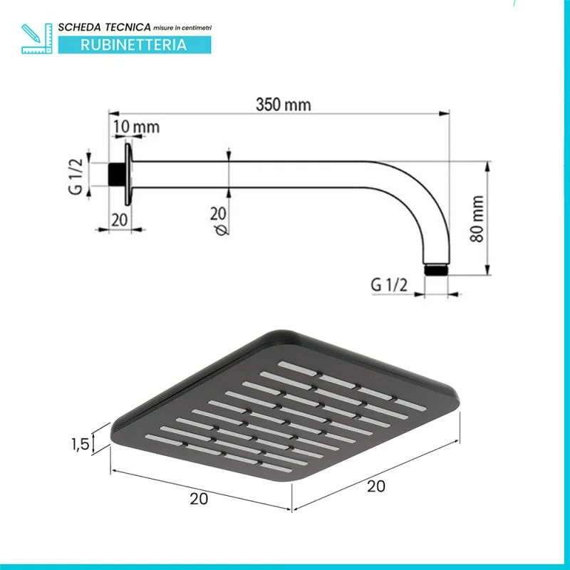 • Dimensione soffione: 20 x 20 H 1,5 cm;