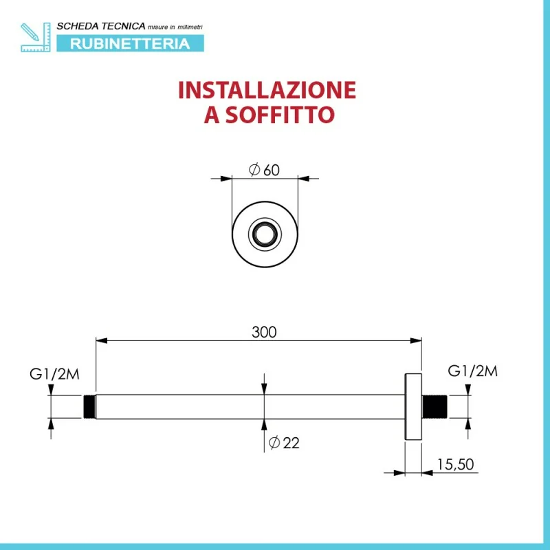 • Tipologia: braccio a soffitto e soffione doccia tondo;