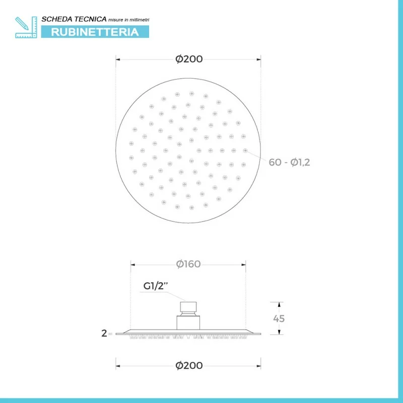 • Dimensioni soffione: diametro 20 x H 2 mm;