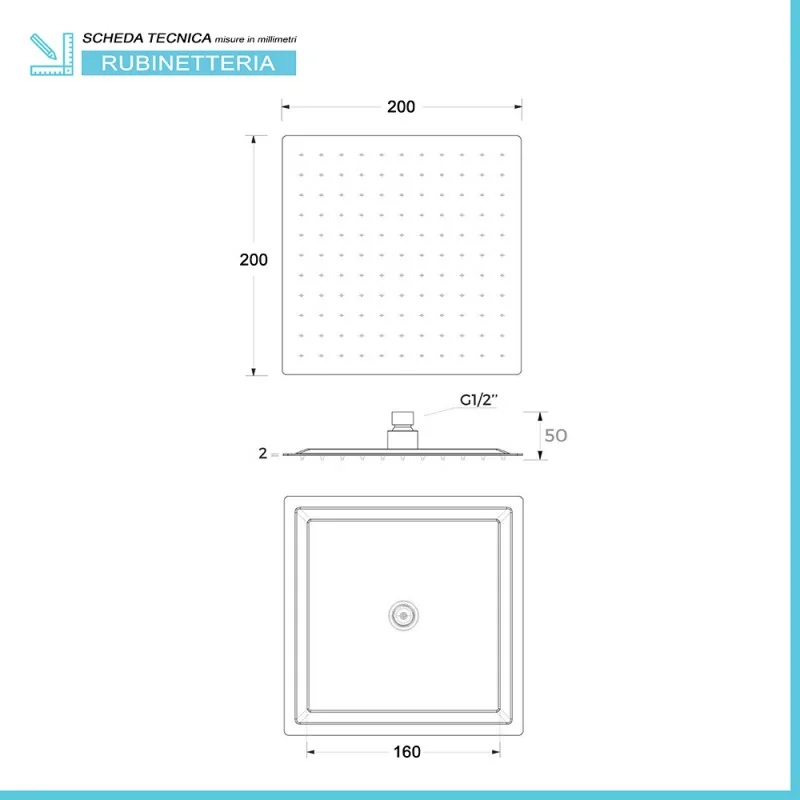 • Dimensioni soffione quadrato:  20 x 20 cm;