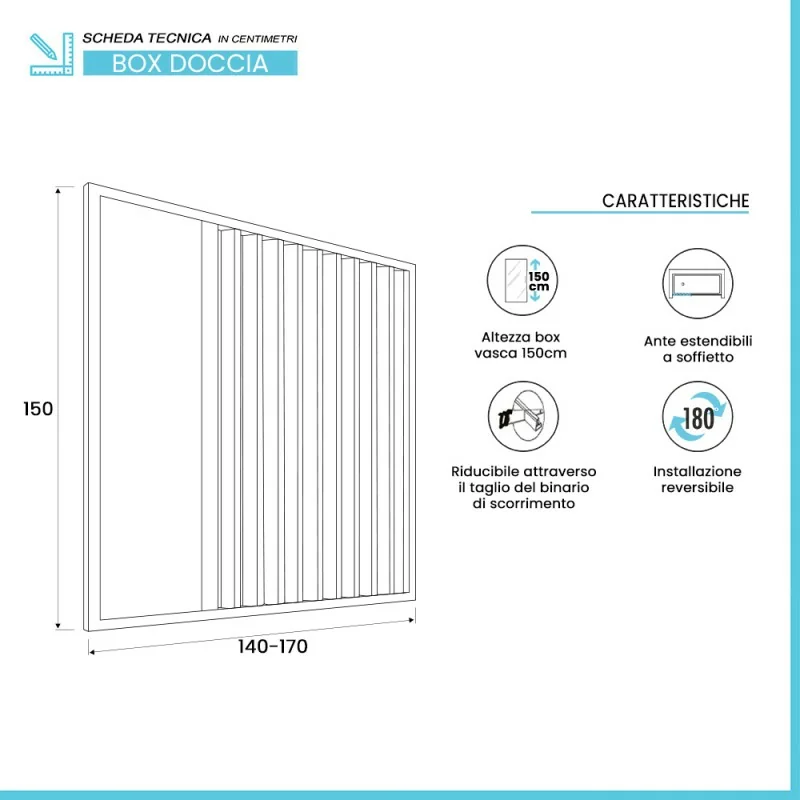 Box vasca anta unica a soffietto 170 cm in PVC bianco reversibile e riducibile Teti