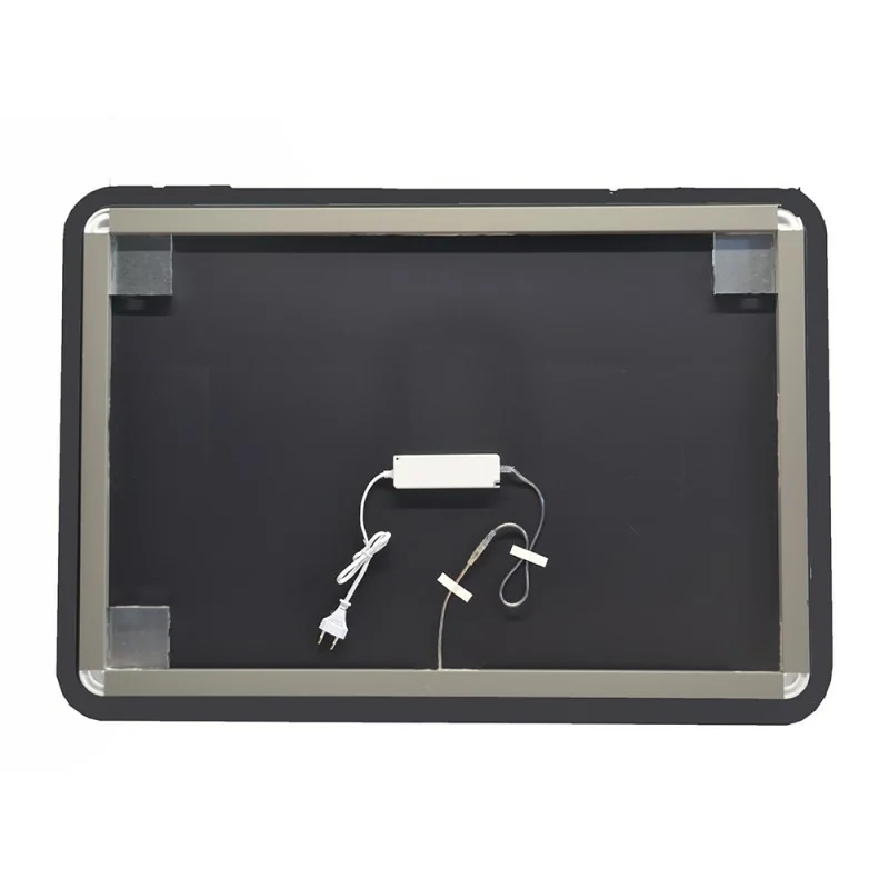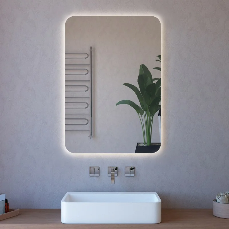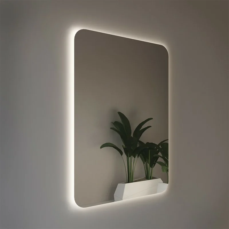 Specchiera LED rettangolare a filo lucido con installazione reversibile e angoli raggiati