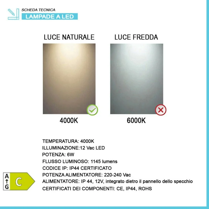 • Luce naturale con temperatura 4000 K e potenza 6 W;