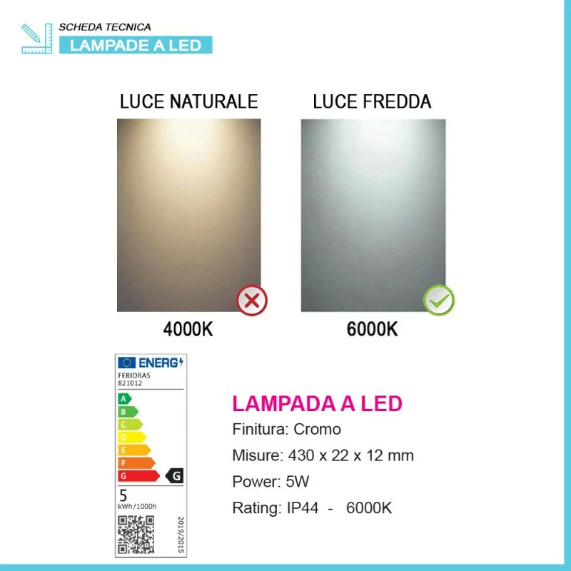 • Illuminazione mediante lampada LED in finitura cromo da 48,5 cm;