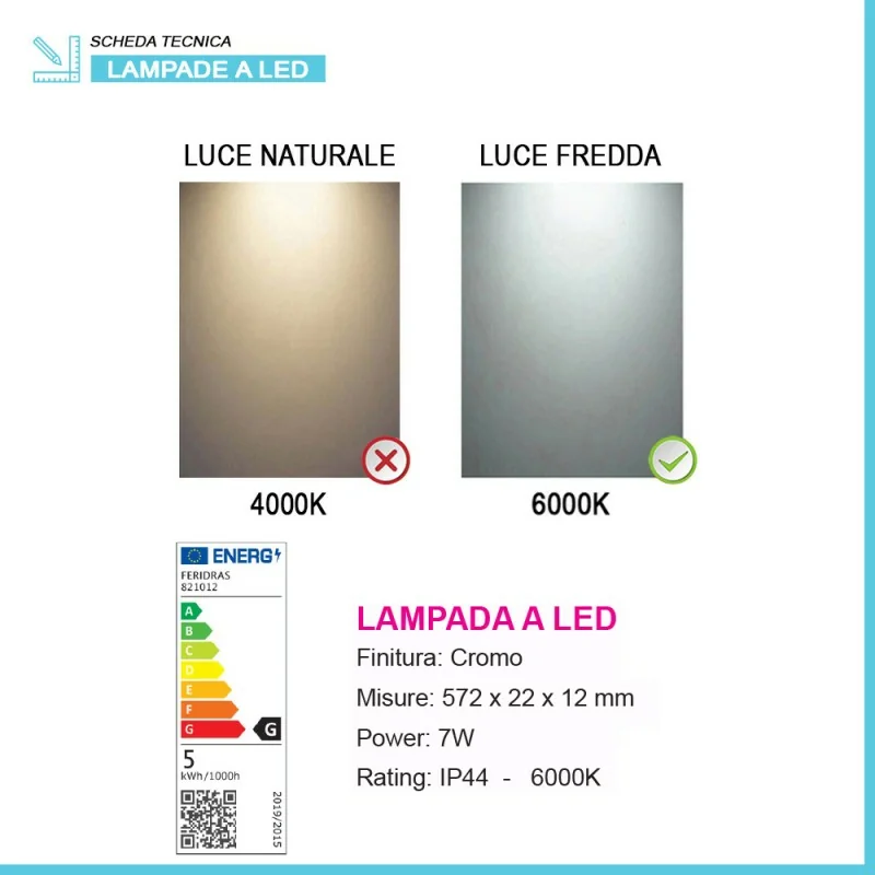 • Illuminazione mediante lampada LED in finitura cromo da 63,5 cm;