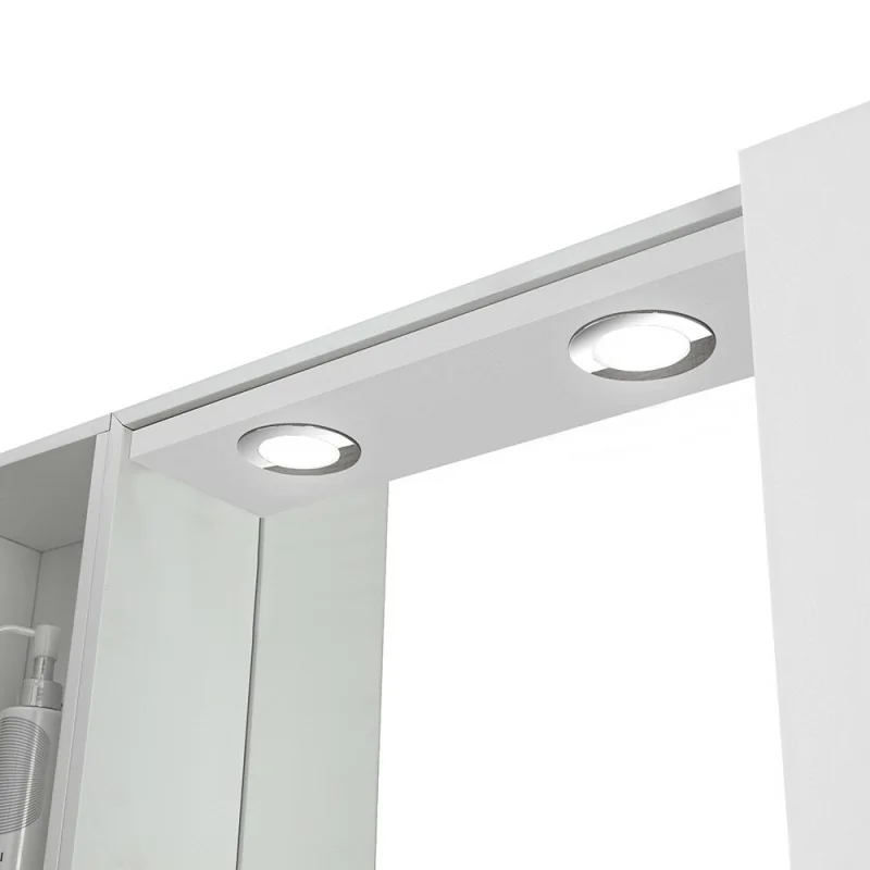 La specchiera è realizzato in legno melaminico con una finitura bianco lucido che si adatta facilmente a diversi arredamenti;dispone di pensili laterali con apertura esterna,per un interno con ripiani  in vetro in cui riporre gli oggetti da bagno. Sul lato superiore sono inoltre presenti faretti con pratica illuminazione LED.