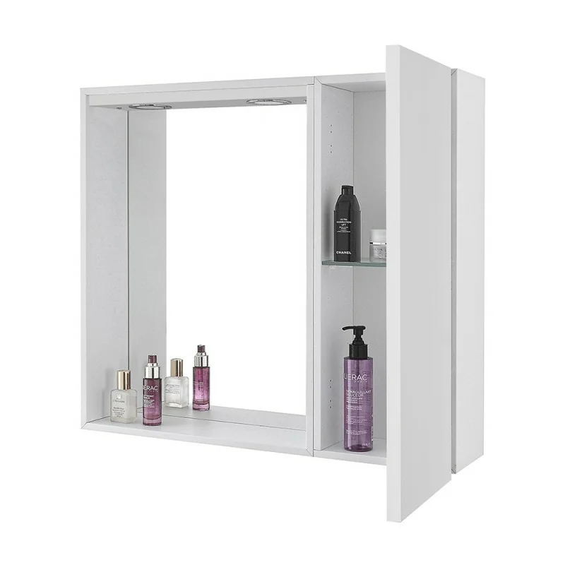 Specchio contenitore 68x61 cm bianco lucido con anta a destra e LED