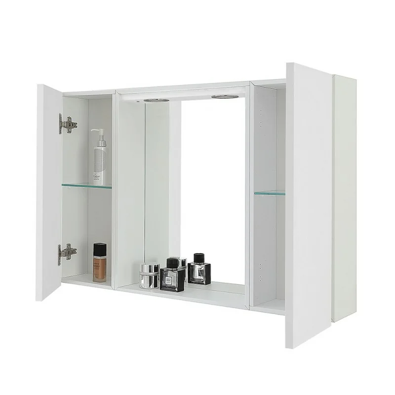 Specchiera contenitore con ante ad apertura esterna, ripiani e faretti LED superiori