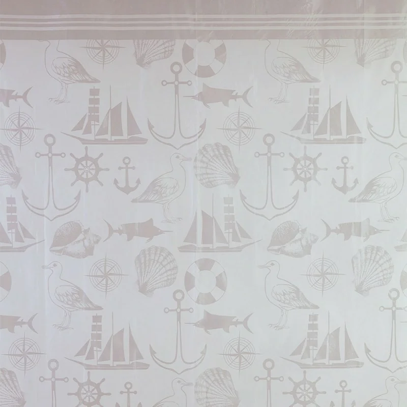 Tenda doccia di design 180 x h 200 cm in acrilico dal fondo bianco con motivi marini beige completa di gancetti di fissaggio