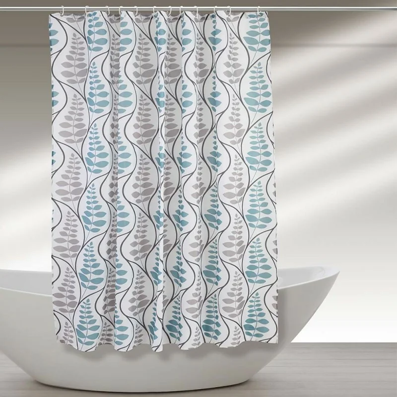 Questa tenda da doccia,dalle dimensioni standard di 120x200 cm,è realizzata in tessuto poliestere di alta qualità,un materiale resistente all'acqua e facile da pulire. Il suo colore bianco con tanto di fantasia a foglie azzurre e grigie moderne e funzionali,la rende perfetta per qualsiasi stile di bagno.