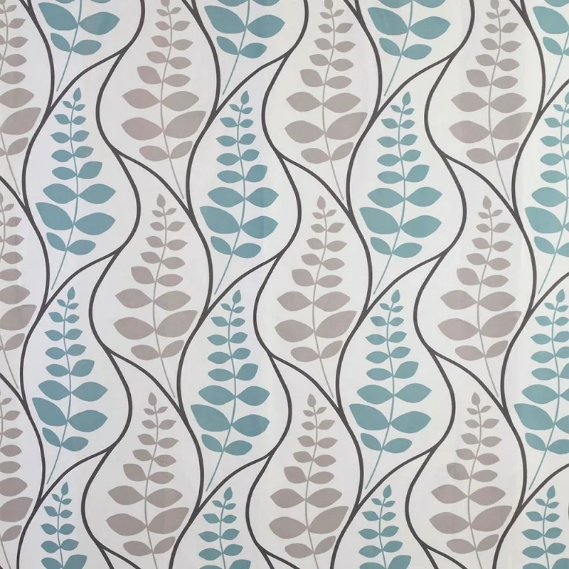 Tenda doccia elegante 120 x h 200 cm in tessuto poliestere dal fondo bianco con fantasia a foglie azzurra e grigia completa di gancetti di fissaggio