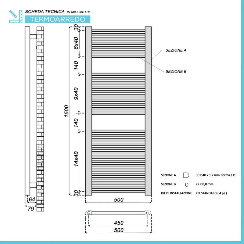 Termoarredo elettrico – 700w H150 x L50 interasse 45 cm compreso di kit montaggio a parete