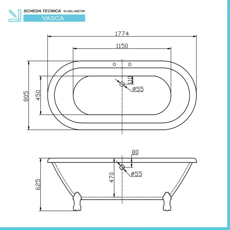 • Dimensioni Vasca: 177,4 x 80,5 cm