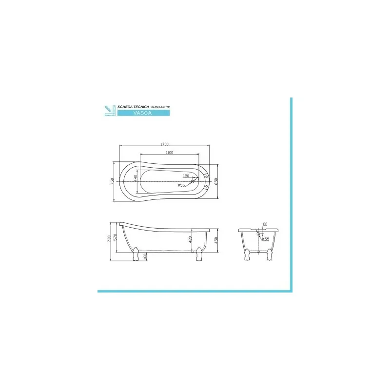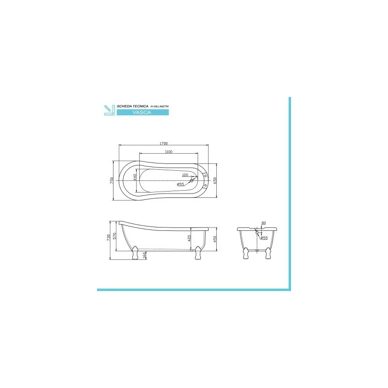 Vasca da bagno freestanding classica 170x75 con Piedini cromo a zampa daquila regolabili Mary