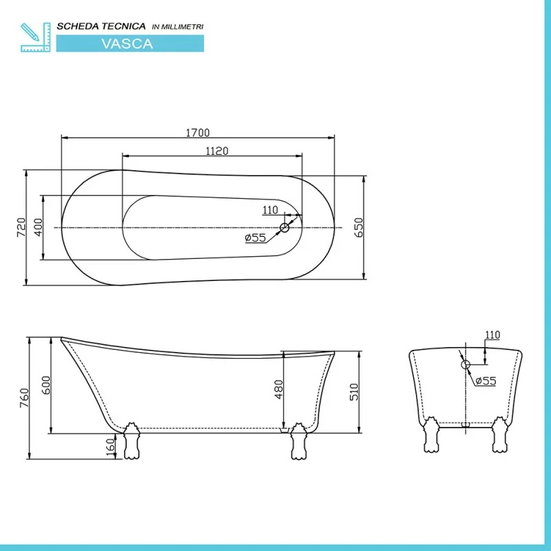 Vasca da bagno freestanding classica 170x72 Piedini cromo a zampa di leone regolabili Samantha Scheda tecnica della Vasca da bagno freestanding Samantha Caratteristiche tecniche della Vasca da bagno freestanding Samantha