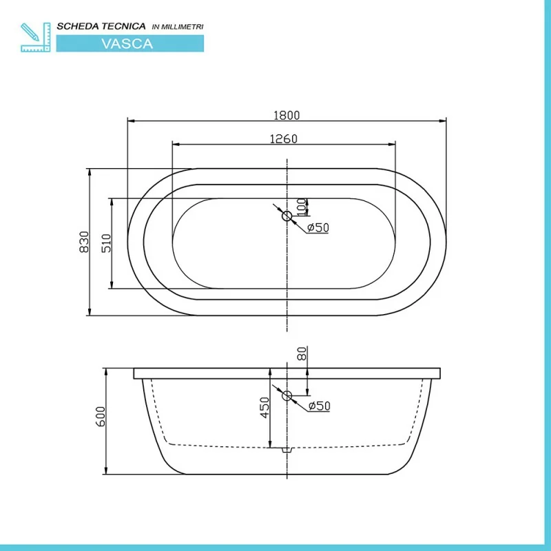Vasca da bagno freestanding moderna 180x83 Piedini interni regolabili Allison Scheda tecnica della Vasca da bagno freestanding Allison Caratteristiche tecniche della Vasca da bagno freestanding Allison