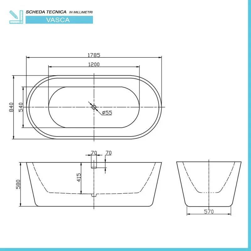 Vasca da bagno freestanding moderna 178,5x84 con Piedini interni regolabili Alexandra II Scheda tecnica della Vasca da bagno freestanding Alexandra II Caratteristiche tecniche della Vasca da bagno freestanding Alexandra II