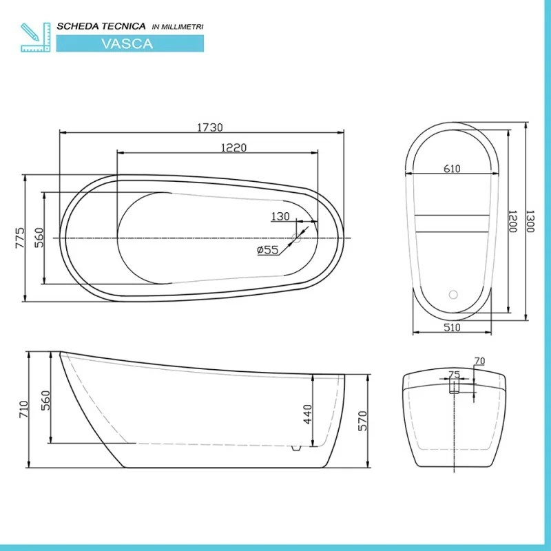 Vasca da bagno freestanding moderna 173x77,5 Piedini interni regolabili Antalia Scheda tecnica della Vasca da bagno freestanding Antalia Caratteristiche tecniche della Vasca da bagno freestanding Antalia