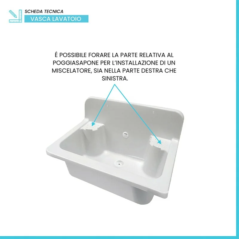 La vasca lavatoio dispone di pratico ripiano poggia sapone,ideale per avere a portata di mano tutto ciò che serve durante  il lavaggio della biancheria. Per una rapida installazione, la vasca lavatoio presenta dei pre fori per la rubinetteria sia lato dx che sx ed include i fissaggi per il montaggio a parete.