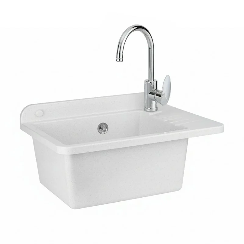 Compatto e resistente, il lavatoio in resina bianco con miscelatore a canna alta in acciaio inox unisce design e funzionalità. Ideale per lavanderie o spazi esterni, è facile da installare, completo di scarico e sifone, per una soluzione pratica e duratura.