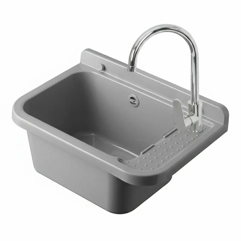 Il pilozzo in resina grigio 50x34 con miscelatore a canna alta in acciaio inox è pratico, resistente e completo di scarico incluso. Ideale per lavanderie o spazi esterni, combina design moderno e funzionalità in una soluzione compatta e facile da installare.