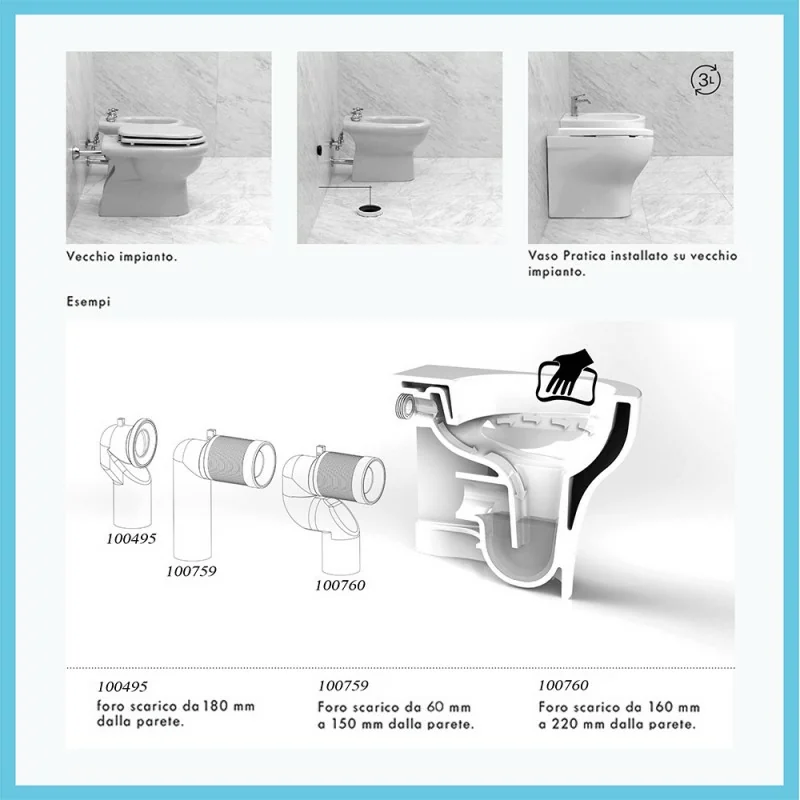 Wc filo muro scarico traslato rimless Azzurra serie Pratica Wc scarico traslato rimless filo parete Azzurra serie Pratica Scheda tecnica wc filo muro scarico traslato rimless Azzurra serie Pratica Scarico traslato del sanitario Azzurra serie Pratica compatibile con diverse curve tecniche Vaso traslato Azzurra serie Pratica rimless a muro Tecnologia Easyclean senza brida del water filo muro traslato Azzurra serie Pratica Sanitario filo muro con scarico traslato Azzurra serie Pratica