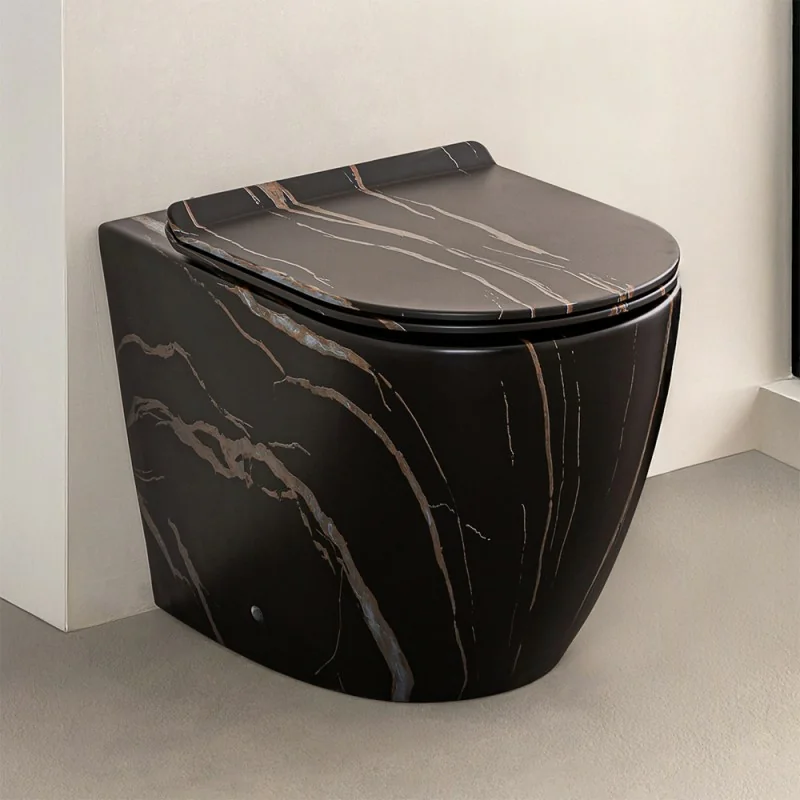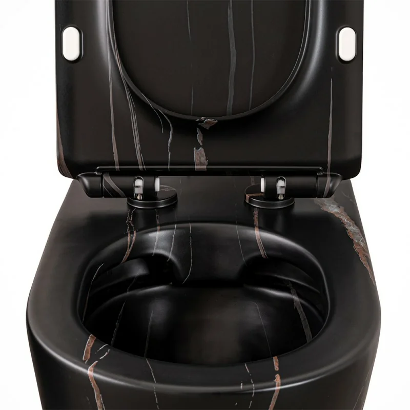Vaso a filo muro senza brida in ceramica effetto marmo nero Tokyo,copriwc soft-close con sgancio rapido