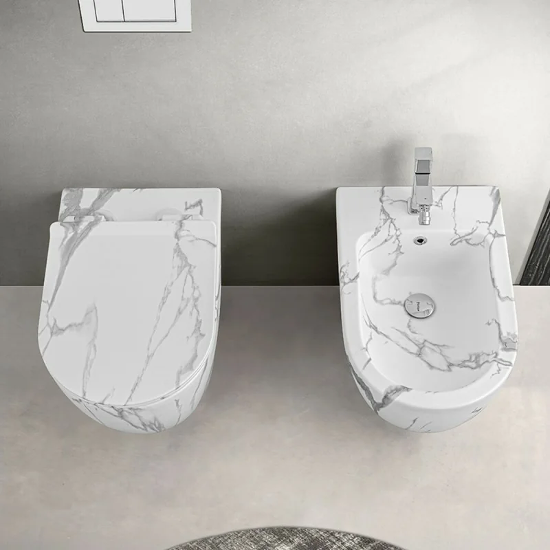 Water a filo parete senza brida Tokyo in ceramica effetto marmo bianco completo di copriwc rallentato
