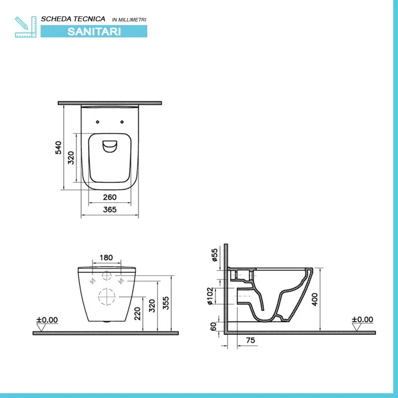 • Wc senza brida con scarico a parete,altezza pavimento-centro scarico 22,5 cm;