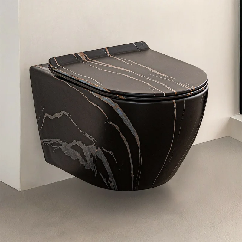 Water sospeso senza brida in ceramica effetto marmo nero Tokyo,copriwc soft-close con sgancio rapido