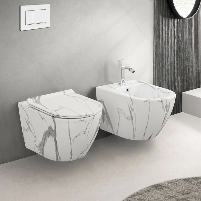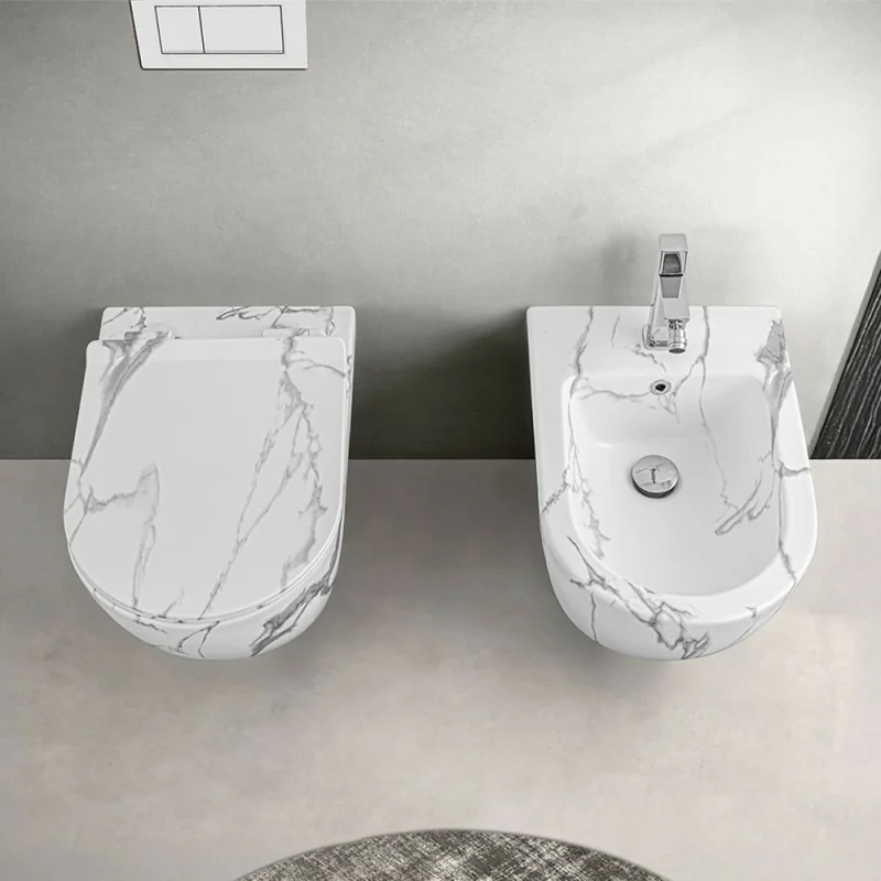 Water sospeso senza brida serie Tokyo in ceramica dall’effetto marmorizzato bianco completo di copriwc rallentato